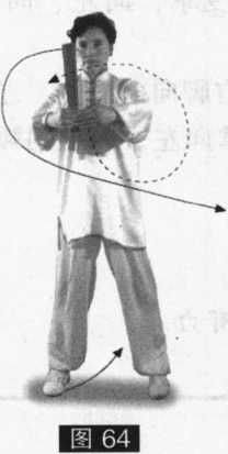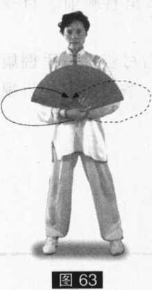 2.合扇举抱:身体不动,两手分开,顺势合扇,两手经体侧划弧抱于体前, 两臂撑圆,扇顶向上。目视扇顶。(图64)