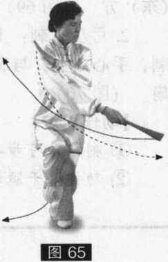 1. 转腰合臂:上体左转,右脚提收至左踝内侧,两臂交叉合抱于左胸前。目 视左下方。(图65)