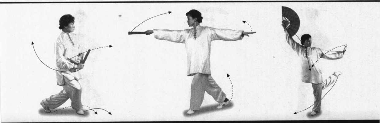 3. 插步抱扇:左脚向右脚侧后方插步。右手持扇下落,抱于怀中;左手随之 下落,附于右腕内侧。目视前方。(图100)