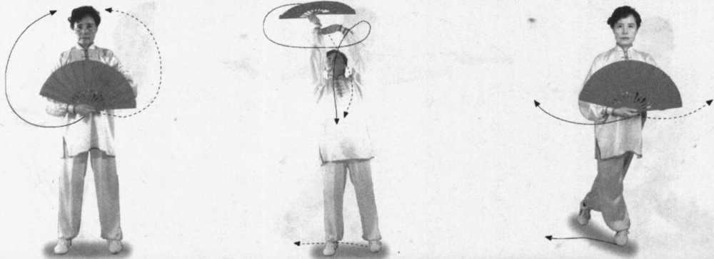 ② 云扇时仰头挺胸,腕指要灵活,扇面在头上翻转平云,与(二十四)合 扇云摆不同。