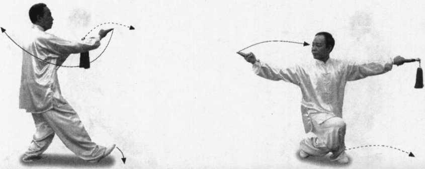 ④ 左手持剑穿出后,左前臂要稍内旋,使剑贴于臂后。