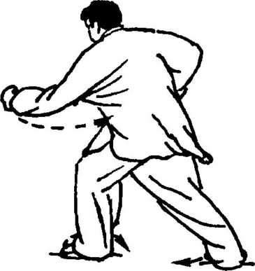 1. 接上动。随后坐,继之前 移并右稍后转(面东),左脚尖里 扣踏实,右脚后撤半步,足前掌着 地,成右虚步;同时,随含蓄胸腹,
