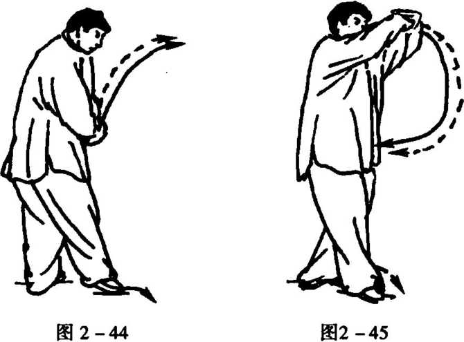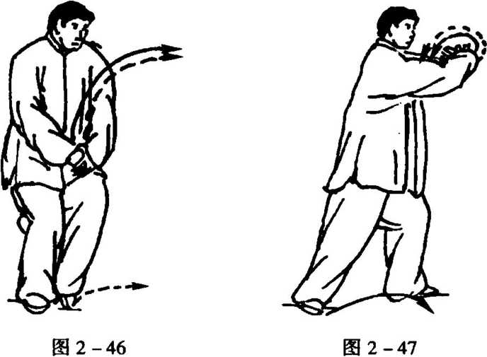 2. 随直身并稍右转前移,右 脚尖外摆稍前移,全脚踏地,重心稍前;同时,两手合而右前上 立狐环举头顼前,眼看两手(图2 - 45)。