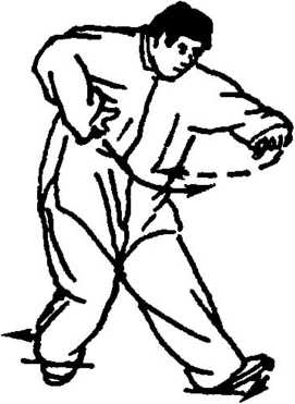 同时,随右转胯 左弯腰,胸深含 腹深收,一身如 弓,左臂如弓外