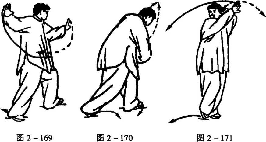 11. 随左转身并前移,右脚跟抬起,成半歇步。身手动作详 见图2 - 161说明(图2 - 170)。