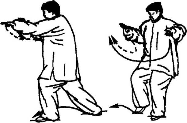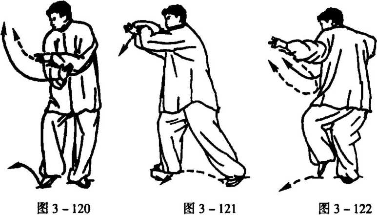 10. 接图3-128续做反向图3- 121至图3 - 127动作,但左右相反,即 先做右势(图3 - 125至图3 - 127)后 做左势图3-120至图3-123返回,