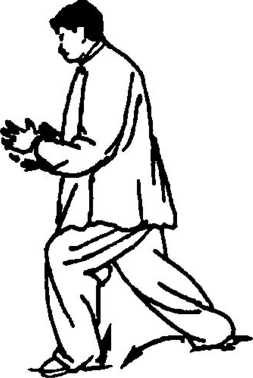 5. 随转左移上体,再成左闪身,左脚变实,右脚随跟并左脚 内侧,再成右丁步。同时,两手合抱势 随身环摆,再次蓄于左腋前,眼向右 前睨视(图1 -225)。