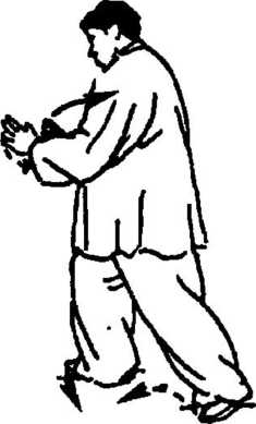 4. 随左转身,闯左步,前撞身,成左弓步;同时,两手相对 照,如合住人之两胁,挫而抖身、震臂合击挤之,并伴以“哈”音, 猝发惊击,合整一身,眼看两手,手距不 过半尺(图3-123)。