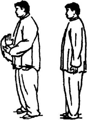 3. 左脚里合并步站立,两手 臂自然松垂体两侧,身正气和,呼 吸三次,收势(图3-132)。