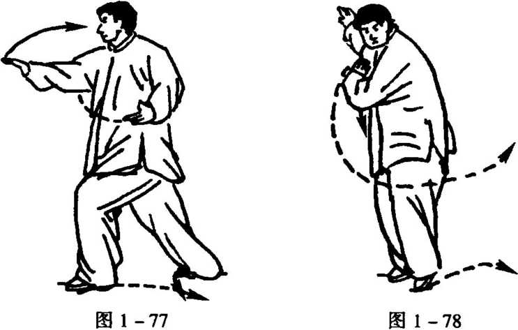 1. 接上动。随向后移身,右脚变实,左脚后撤右脚心内侧, 脚尖点地,成左丁步;同时,又随含胸收腹稍后转腰,沉裹左肩后 摆右肩,两手右摆相顺,右手俯掌摆抹右肩侧,左手俯掌摆抹胸 右前,尽成转闪化吞之势,转脸睨视左后(图1 -78)。