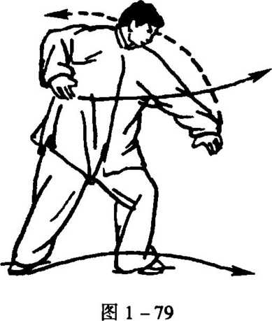 2. 随左转成右侧身,上左步并随向前移身成左弓步;同时, 左手向前,经膝前向左做左搂手至左膝前上方,手心朝左,指尖 朝前下;而右手随屈肘里摆斜提右腋下,手心斜朝上,指尖朝前 下,眼看左手(图1_79)。