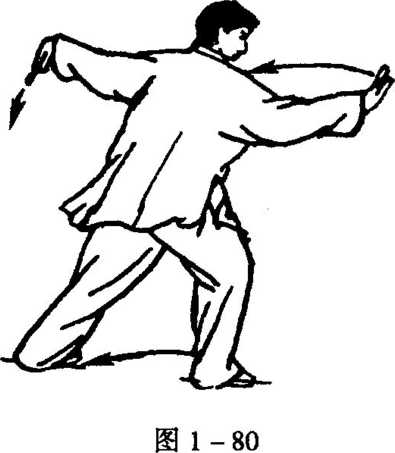 3. 随向前移身而左转成左侧身,右脚进提左小腿内侧,两 手不变,仍成含蓄之势。继之向前撞身,闯落右步并成右弓步; 同时,左手向左后上提手(非勾)后上提展,稍高于肩;而右手则 向前,转挑前推,以“哈”音助威,手不低于胸,眼看右手以远,成 右单鞭势(图1-80)。