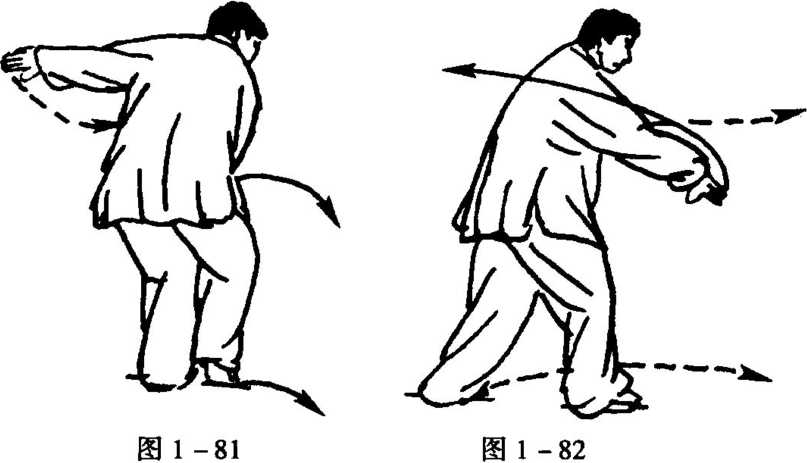 4. 随重心后移抽身闪离,左脚变实,右脚随之后撤左脚心 内侧,脚尖点地,成右丁步。同时,又随含胸收腹沉裹右肩,两手 向左,左手展开,手心斜朝后下,右手俯掌向左拦抹左胸前,右 手臂与左手臂相顺,转眼右睨(图1 -81)。