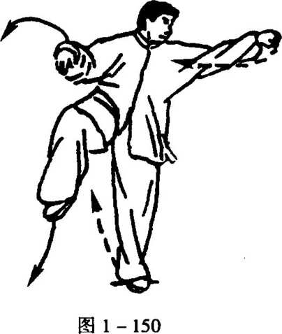 4. 左脚蹬而右纵身侧倾,右脚向右跃落,右脚落地,右腿直 立;左膝高提,左脚下垂,再成右独立步;同时,右手撮指高提向 右成右侧点,伴“嘿”音叫整叫齐,左手则变散掌,垂吊左膝上, 眼看右手,详情参照以上说明(图1 -151)。