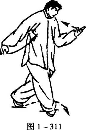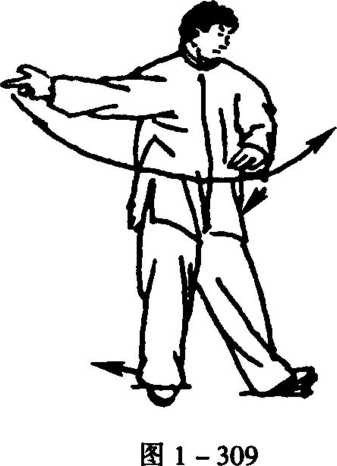 1. 接上动。随稍左转直身,左脚微外开落步,脚跟着地,如 左虚步;同时,左手下拦左膈前;右手则边外旋手心上翻,边向上 展托右肩侧,眼看前下方(图1 -309)。