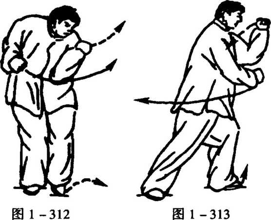 4. 随前移身并稍右转,左脚进至右脚内侧,脚尖点地,成左 丁步;同时,随深蓄胸腹,沉欺左肩成进身靠,两手握拳,左小臂 随屈肘上叠,拳合左肩前,并随向里盘肘,成挂臂;而右拳则屈 肘上抬,蓄于腰右侧,尽成蓄势,眼向左看(东)(图1 -312)。
