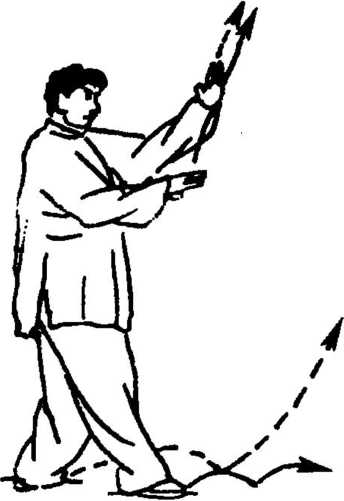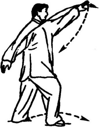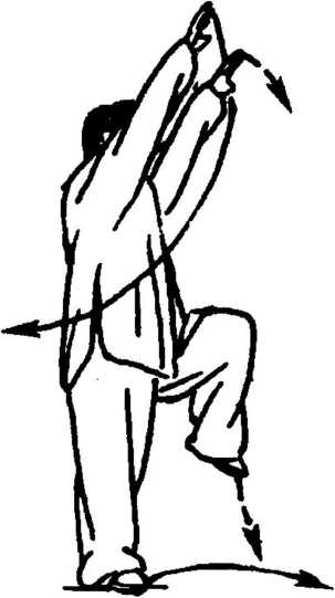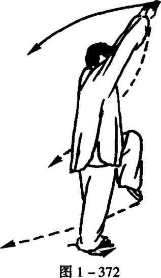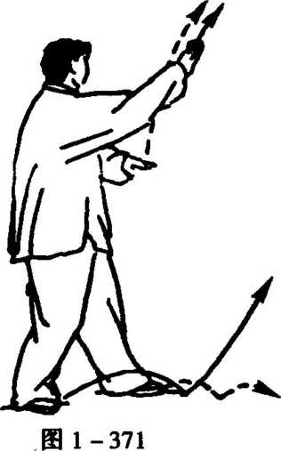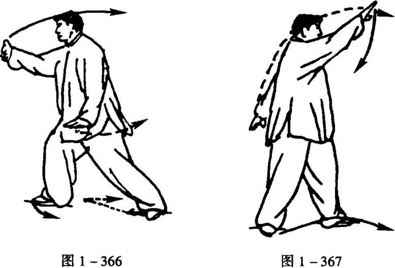 右手俯掌向后下抽按胸前,指 尖仍朝前上;左手则挑胸前,从 右手内侧向上而稍左搬手,左 臂舒展,手指斜朝右前上,稍高 于头顶,右手在左肘里侧下,眼 前视(图1 -368)。