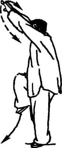 1.接上动。随左转身向右落右 脚,并随右移身,右脚站实,屈右膝, 成右侧弓步,但步幅不大;同时,两手 握空心拳一齐向右下摆动,右拳内旋 拳心外翻,并随右肘外展,一臂如弓, 撑于头顶右侧上,拳顶斜朝左前;左 拳则向右下拦挂右肩前,拳心斜向右 后,拳顶斜朝右下,眼向左看(图1 - 375)0