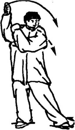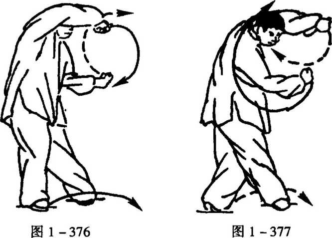 3. 随进身盖进右步,左脚跟抬起,右腿直而左膝稍屈,两腿 交叉;同时,左胯外摆,向右拧腰右弯,沉右肩吊左膀,两臂如弓 相对,拳势不变,如抱一球而向右摆滚挂,右拳边外旋边手心上 翻而转于下;左拳边内旋,边手心外翻转栽于上,两拳顶相照应, 相距与肩同宽,眼看右下,再成右摇头势(图1 -377)。
