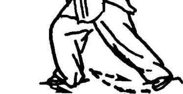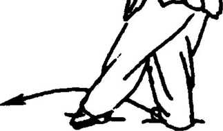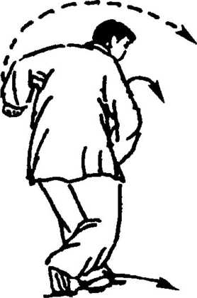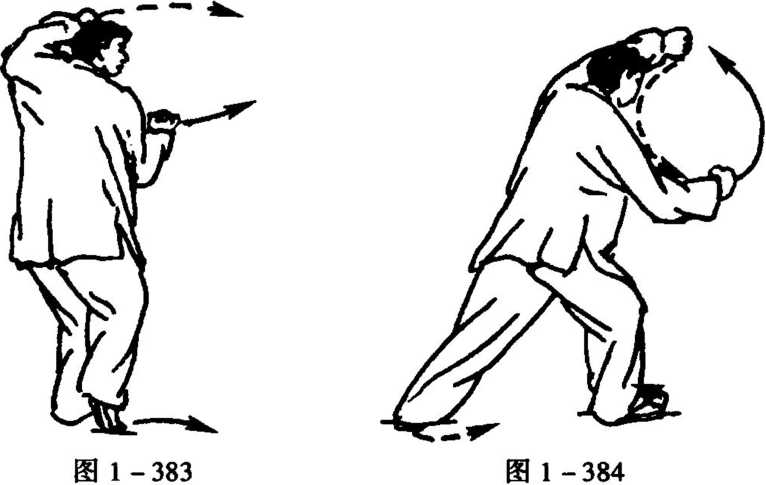 11. 右脚尖里扣,向前移身并左而稍后转,左脚尖外摆后 撤,全脚踏地。身手动作如图1 -377说明,但左右相反,而且是 在后转中完成左摇摆(图1 -385)。