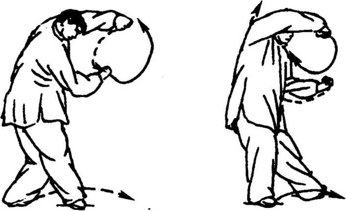 (2)左摇右摆,两臂轮换如球转,全由身带。干动枝摇,是以 本统末,贵在一体柔和。丹田内滚,气转卯酉,乃以气机带身机,