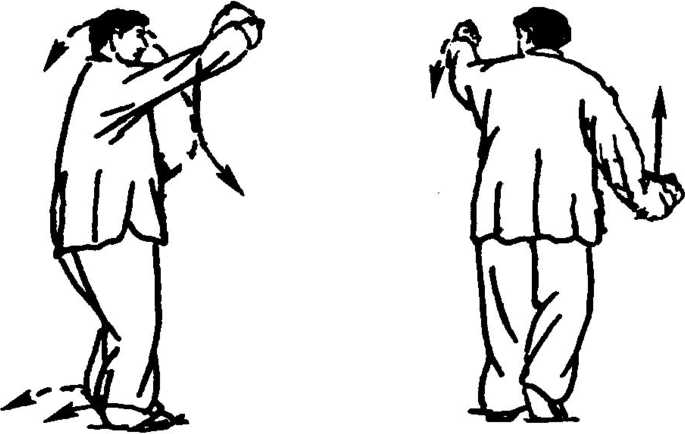 (2) 颠步勿大,尤须轻灵。手臂的缠幅不宜过大(其实两拳 活圆两肩侧即可),缠腕本于活肘,活肘本于转肩,转肩本于摇 身,摇身本于活腰。干动枝摇,肩转臂缠,动动相连自呈环缠柔 象。柔根于松,松根于静。柔极而刚,静极而动。这抖翅双展的 寒战劲,就根于松静松柔,所以,没有良好的松柔功夫,很难得其 真,成其用。