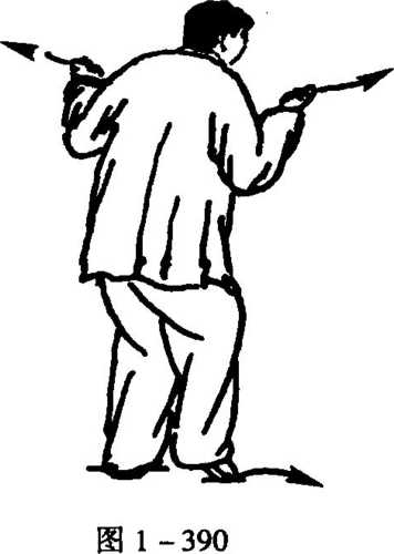 3. 随稍屈膝,含胸虚怀并稍右转,左手后抽,右拳上挑,并 随屈肘,两拳分别端仰两肩外稍前,拳心朝上,拳尖斜朝前外,眼 看右手(图1 -390)。