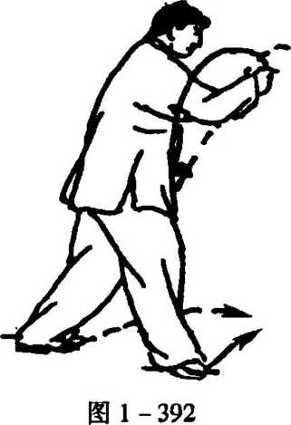 5. 左脚尖里扣,随向 左移身并右转,左脚站实, 右脚悬提左騍内侧;右手向 左下抽蓄左胸前,拳心朝 上;左拳向前而下扣于腰左 侧;不停,进右步,并随向欺 身寸撞,成右弓步;同时,右 拳向右前上寸劲冲点,眼看 右拳(图1-392)。