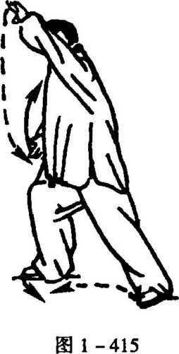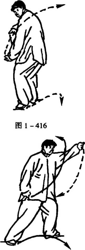 2. 左转身,并左前上左 步,随向左前闪靠成左弓步;同 时,两手握空心拳(拇指尖与食 指尖相抵),左拳随倾身左靠展 臂外撑,向左肩斜上云搬,高与 头顶平,拳眼朝上;右拳展伸右 胯侧,拳心朝里,眼前视,但意 注左肩(图1-417)。