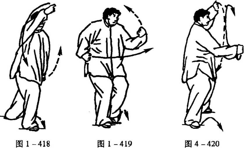 4. 随向前进身,右脚仍实,左脚进至右脚内侧,脚尖点地, 成左丁步;同时,两拳握实,随稍右转身,含胸收腹,屈左肘挑小 臂端平(朝前)外旋里摆,成拦肘,扣腕挑拳,拳顶斜朝前上;右拳 向下,立拳抽于腰侧,拳心朝里,眼看左拳前(图1 -419)。