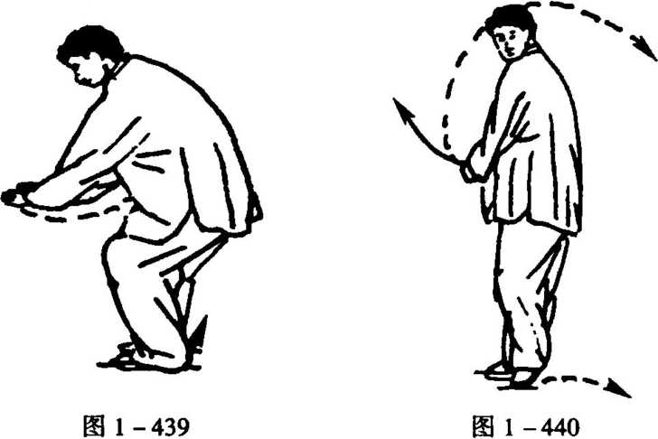 1. 接上动。随起身,左脚稍右后撤,脚尖着地,右脚尖稍里 扣,成左丁步;同时,又随稍左转含虚胸怀,两手握拳,左拳右摆 右腹下,拳心朝里;右拳展摆右胯侧,拳心朝里,转脸向左后睨视 (图 1-440)。