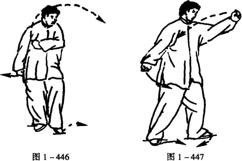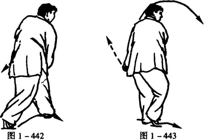 4. 随起身并稍右转,左腿稍直,左脚仍实;右脚进至左脚内 侧,脚尖点地,成右丁步;同时,又随含胸沉裹右肩,两拳一齐左 摆,右拳左摆左胸前,左拳向左下摆至臀左侧,拳心朝里,成为蓄 势;眼向右后睨视(图1 -443)。