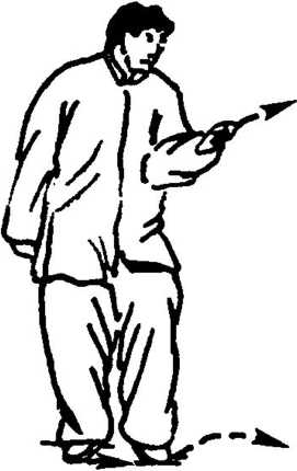 2. 蹬右脚,左脚前闯小步,右脚 随之擦进,成抢步,两脚稍直,重心 在前脚;同时,又随展身,左拳向前 上,一触天突即点撞惊发,并以鼻音“哼”协整一身;而右拳仍自 然下垂右臀侧,眼看左拳前(图1 -451)。