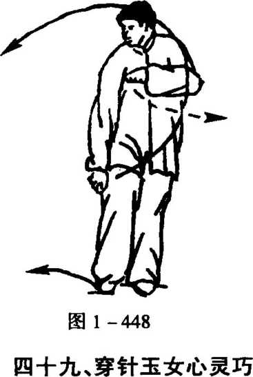 8. 左脚尖里扣,并随重心前移而左转,左脚仍实;右脚里并 左脚内侧,成右丁步;同时,左拳里拦右胸前,拳心朝下;随含胸 虚怀沉裹右肩,右拳臂里滚,右拳里摆右大腿外侧,拳心朝外,转 脸向右后睨视(图1 -448)。