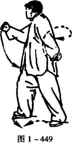 9. 从图1 -448续做反向图1 -441至图1 -447动作,但 左右相反。即以右左右反背捶返回结束本势(图1-449)。
