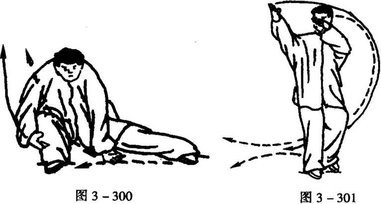 前,左手仰右手合,成右仆步大捋,眼看右手(图3-300)。