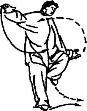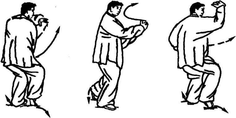 怀,左手后抽,蓄于腰左侧;随丹田向右I \ > 顺时平转一周而转腰,摇转右肩,右小 V Z \ \ 臂立而向右后上环摆并内旋,右手上 xysh