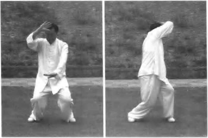 此势先前是俯身,现在屈膝身半蹲;竖顶旋腰手后抹、起身挑掌势要匀