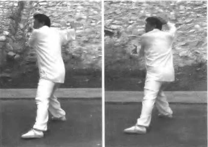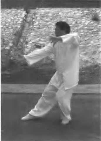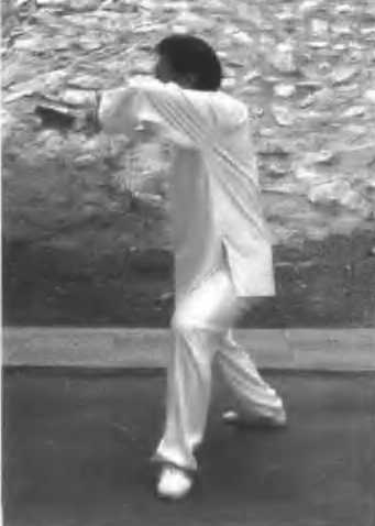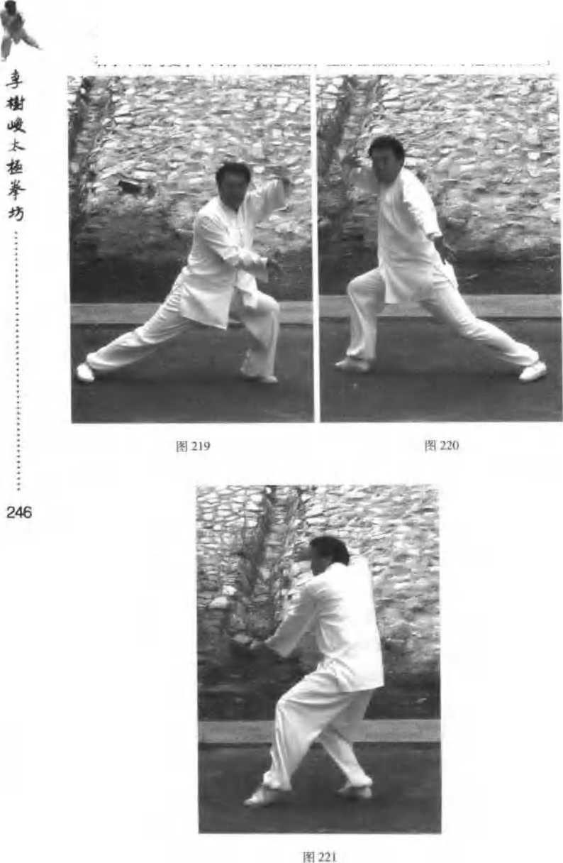 (图 219-221)在手下塌勾变掌,两臂环绕把敌挡;左脚轻轻点出去,双掌连击抖腰脩53.后招(图 222 - 225)后招前招一般同,方向相对左右封;贵在气势要连贯,连环招打不落空:传统暨太极拳图223247图222