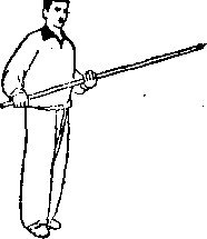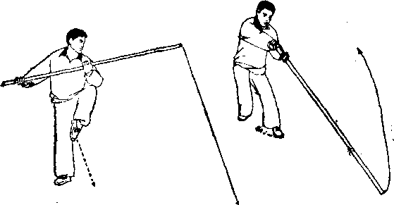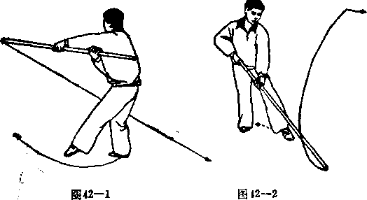 虚步,胸向东南;同时,左手棍梢随转身之势,在体前顺时 针方向环绕半圈,再向东南方地面比去;胸及两脚尖同朝东 南,左臂在前伸直,右手握棍把置于胸前,目视棍梢(图 -42-2)o