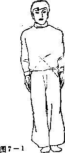动作分解两腿伸直,两脚靠拢;两臂垂于身体两 侧,两手五指并拢;面朝南,成立正姿势站 立(见图7 — 1 )要领说明头要端正,下颏内收,眼向前乎视;挺 胸、直朦、松肩,两臂自然下垂;精神贯 注,呼吸均匀,神情安静。