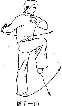 动作分解身体右转,左腿伸直独立,右腿屈膝 上提,小腿扣紧,脚尖下垂,脚面绷平,成提膝势。与此同时,右拳变勾手由东向 下、向后、向上直臂勾起,勾尖朝上。左 手不变,眼仍向东方向注视(见图7 —16) 〇要领说明单腿独立要站稳,右膝要尽量上提。勾手和提膝要在同一时间内完成。