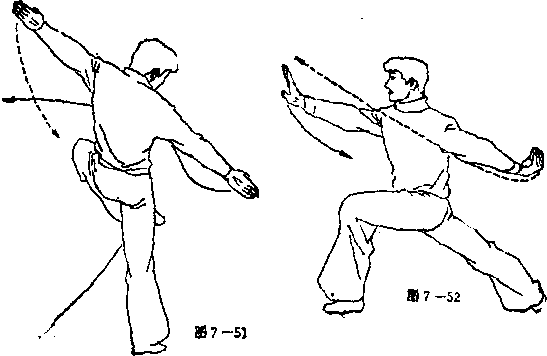 ②动作不停。左脚向左(向西)方向落一步,上体左转,②动作不停。左脚向左(向西)方向落一步,上体左转,①右腿伸直独立,左腿屈膝提起。与此同时,左手向下经 腹前向上、向左上直臂划弧?右手向上、向左、向右下直膂划 弧,眼看右手方向(见图7—51)。