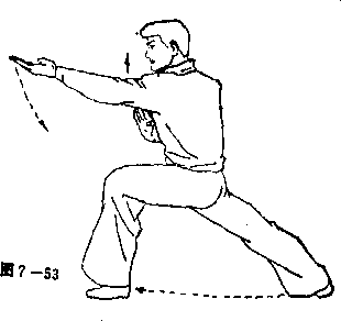 左腿屈膝半蹲,右腿挺膝伸直,成左弓步,与此同时,左掌直 臂向后成勾手勾起,勾尖朝上;右掌经右腰间向西方向平伸前 推,掌指朝上,与眼同高,掌的小指一侧朝前,眼向推掌方向 注视(见图7—52)。
