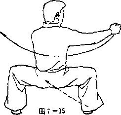 动作分解② 动作不停。左脚向左(向东)落一步,右脚随之向东上 一步,身体向左转,两腿屈膝蹲,成马步勢。与此同时,左 手直臂继续向下、向后、向上划弧一圈至右肩前,掌指朝上, 掌心朝东;同时,右拳迅速向东平伸冲出,拳眼朝上,眼向东 方向注视(见图7—15)。要领说明① 马步下蹲时大腿要与地面平行,两脚尖要朝正前方(忌 外八字),上体不得前俯后仰,要挺胸、直背、塌腰,两脚间 隔约为三脚长。② 冲拳时,臂要内旋向前直冲,使拳螺旋形冲出,加上配 合腰力,使冲拳更富有爆发力。