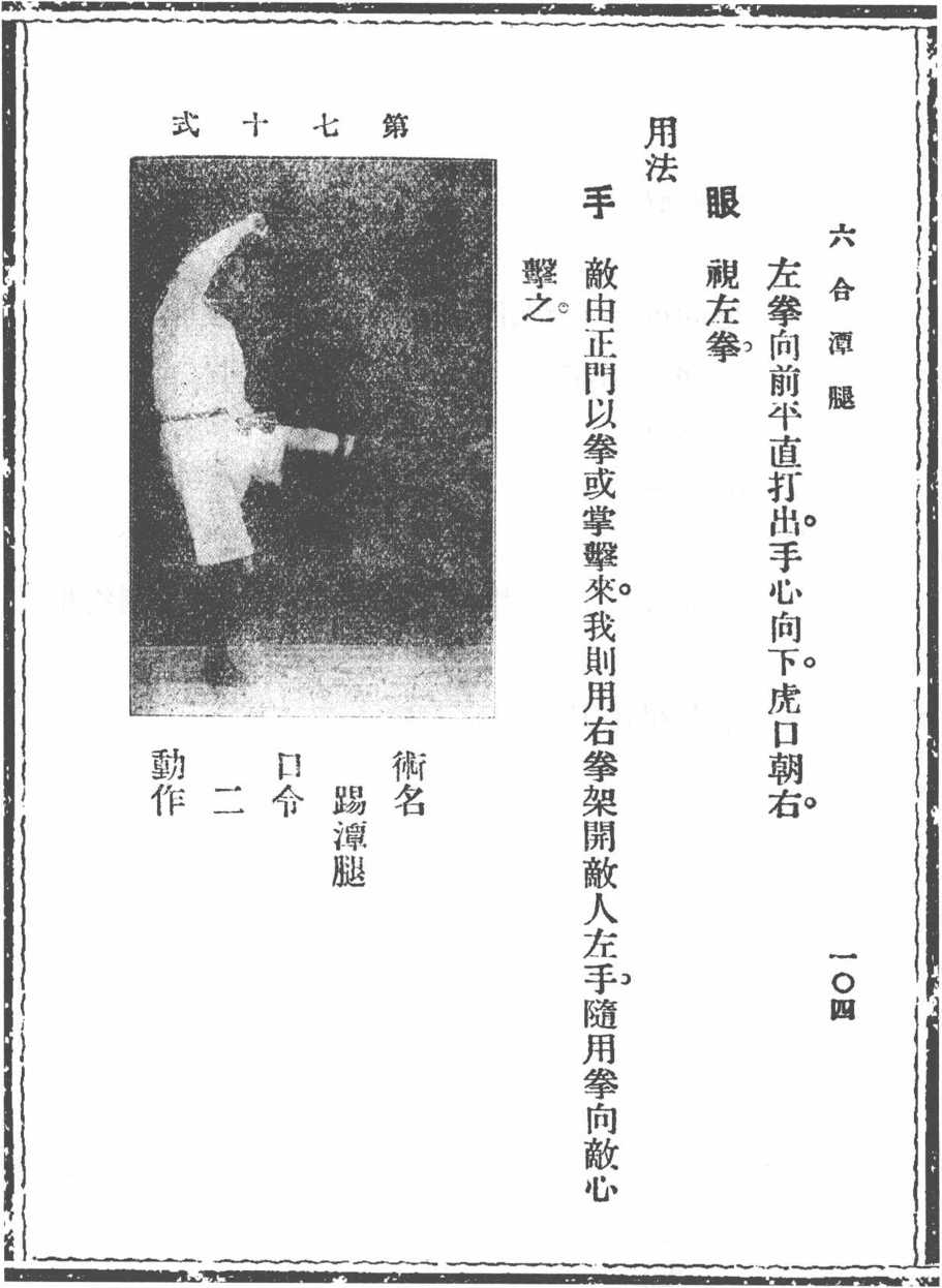 口 令动TT身稍向左转。步右腿原地向上伸,微屈;左足向前平直踢出,随向后收成勾股形。手 左手拐肘贴左肋,手心朝上,虎口朝左前;右拳不动。眼向前平视。用法手 此承上式。敌或用右手反擒我左手。我则将肘一 拐,敌手必松。足随用左足击其腹部。眼 用法手是稍向左厮右腿原地向上微微卧左足向前平直踢外随向彼收成勾股族> > O O 左手拐肘贴左肋餐心朝上虎口朝左前 右拳不tjlO向前平视此承上本敝或用右手反擒我左系我W1招肘一拐敲手必髭 随用左足擎其腹鄙六合潭腿第十八段第十八段第七十一式