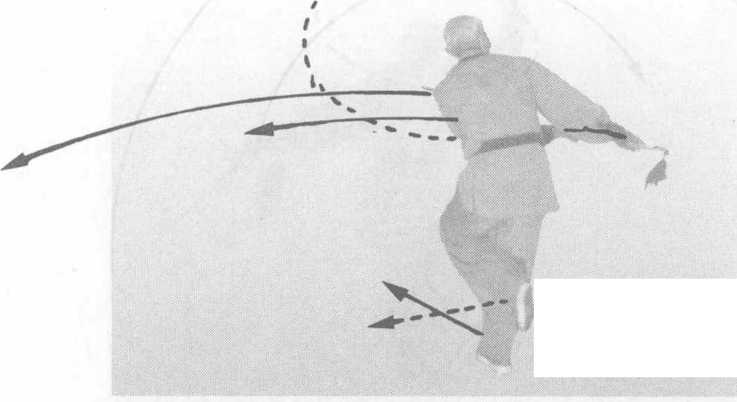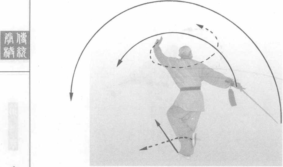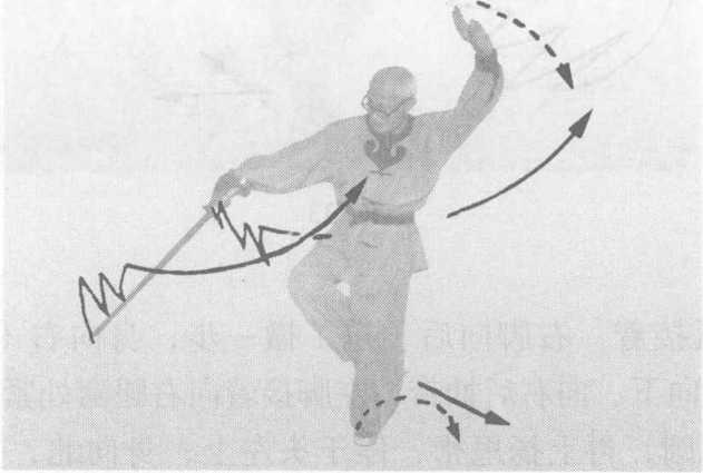 此势亮相优美,右手剑左右前后来回,左右脚互相轮换贴 腿,感受到大自然中的日、月、星三华聚顶之势态。