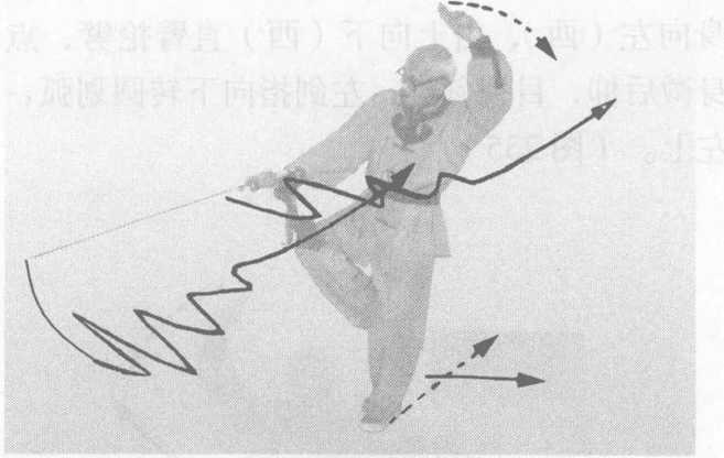 4 .紧接着,左脚向左前(西)迈出,右脚随之向左腿窝 处紧贴;右手与右脚同动,右手剑由右后(东)向右前划大圆 弧,转身向左(西),由上向下(西)直臂抡劈,点击,剑尖 向下;身微后仰,目视剑尖;左剑指向下转圆划弧,甩扬剑指 停于头左上。(图235 )