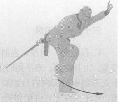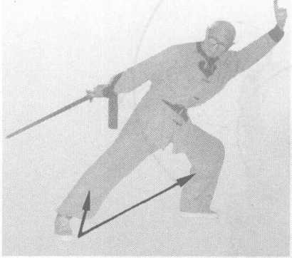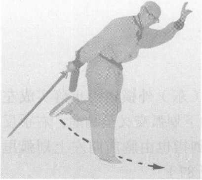 图再左脚蹬、包k亮脚掌向左前迈一大步(类似马蹄后踢状), 双脚交替迈步;右剑、左指不变,头部前伸后缩,身前倾;目 视后方。(图88、图89、图90、图91)