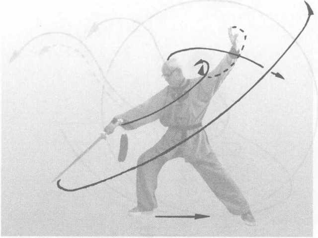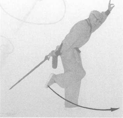 3 .接上势。当左脚前迈落实后,上身与左、右脚同时向 右后(西)扭转成右弓步;右手剑在转身时,由右后向前 (东)转腕划大圆弧,立刃剑向斜前下(西)抡劈;左剑指顺 势向右下划弧再向左上甩扬剑指,停于头左斜上,与右臂、右 剑成斜直线;目视剑尖。(图92)